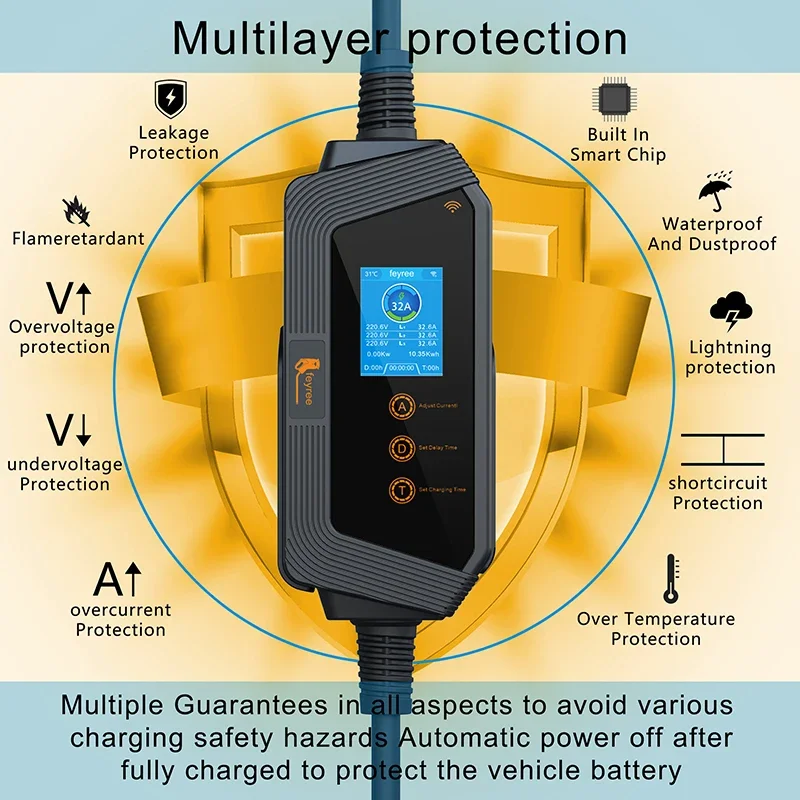 【Secure charging】 Our chargers have safety protection measures such as overcurrent protection, overvoltage protection, undervoltage protection, leakage protection ( TypeB AC30mA + DC6mA ) , and overheating protection, with a waterproof grade of IP66.