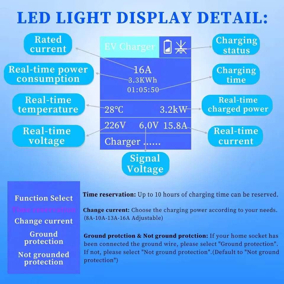 The round shape button “Booking/Switch” is for adjusting current. touch the button lightly to change the current. When you adjust the current, the power plug should be always connected, Car connection plug should be disconnecte